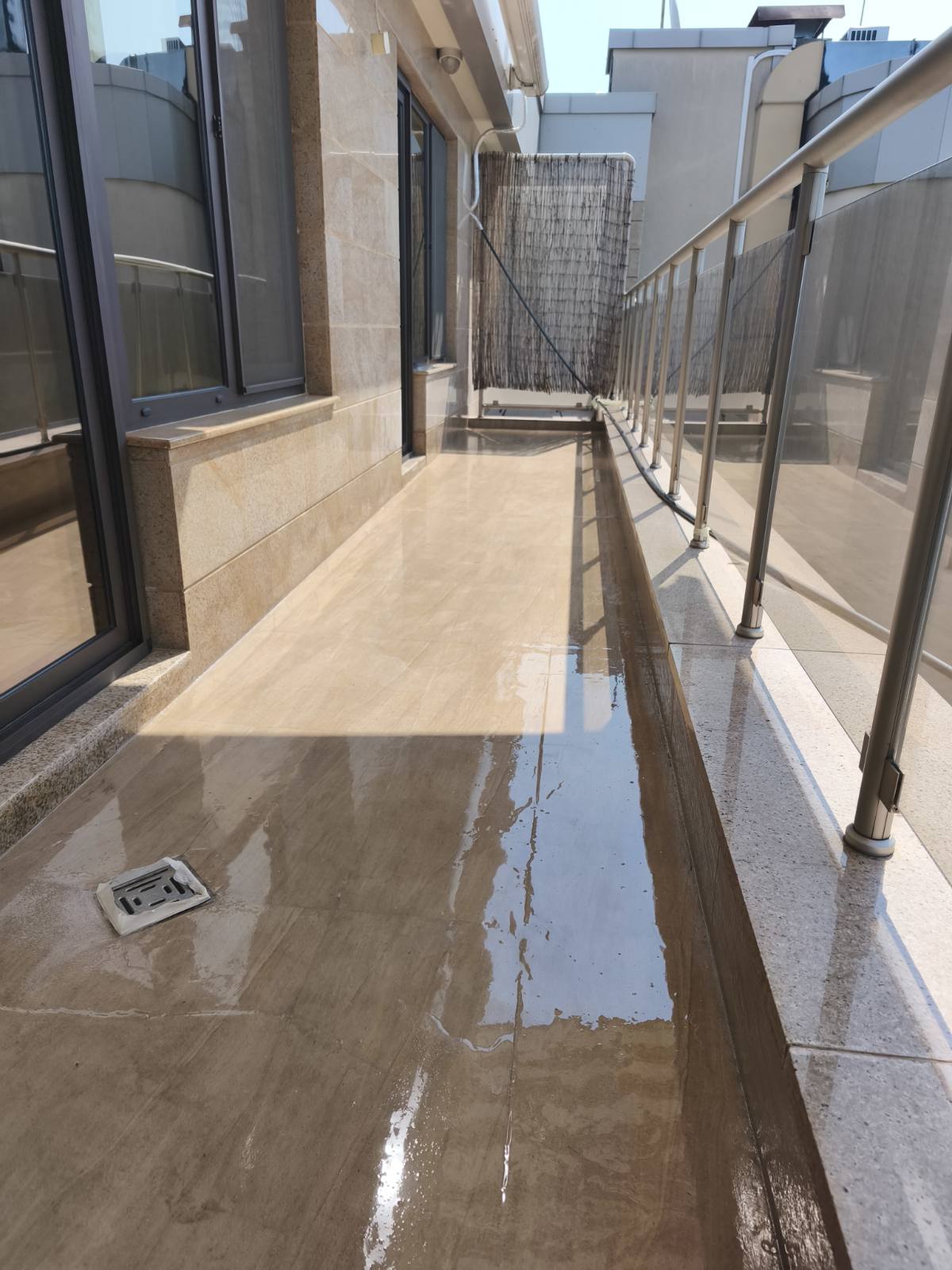 Терасата е надеждно защитена от водопроникване, без промяна във външния вид на настилката. Хидроизолационният слой създава непрекъсната прозрачна мембрана върху плочките и детайлите, която предотвратява бъдещи течове към конструкцията и помещенията под терасата.