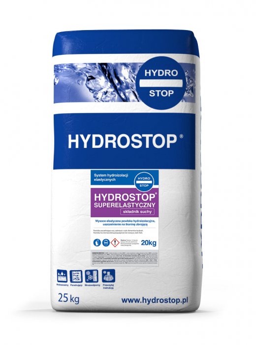 21Супереластична хидроизолация Hydrostop е двукомпонентен продукт, доставян в хартиени торби (сух компонент) и туби (течен компонент). Това е хидроизолационно покритие, предназначено за запечатване на пукнатини, фуги и съединения между конструктивни елементи. Покритието има също така добра адхезия към пластмаси, стомана и акрилни бои.