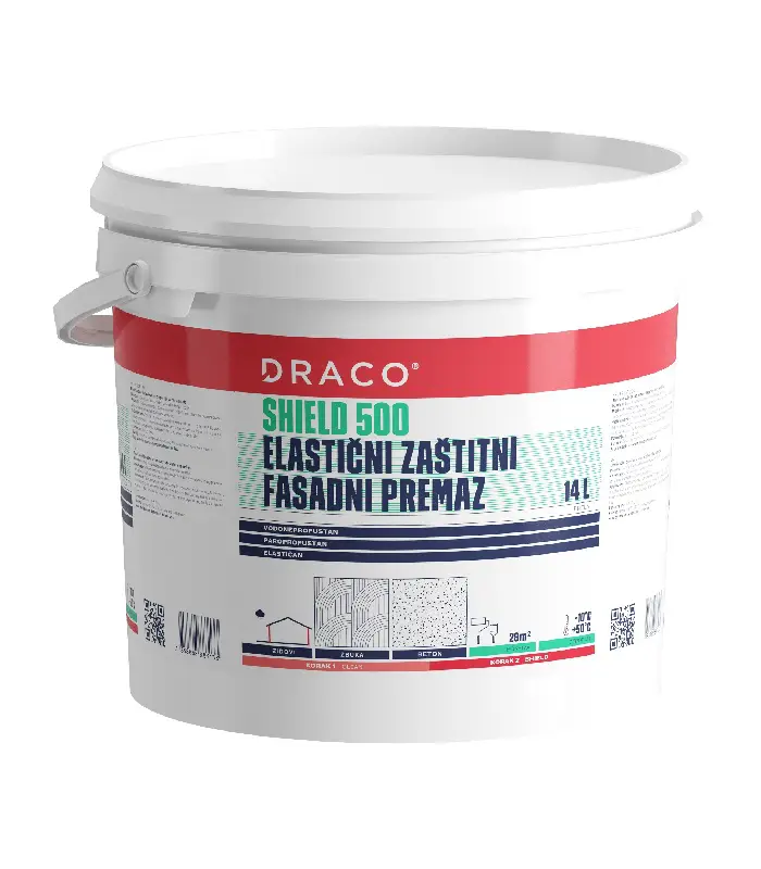 Хидроизолационна фасадна боя DRACO SHIELD 500 е еластична водна дисперсия на стирен акрилат, специално разработена за постигане на висока гъвкавост и отлична устойчивост на агресивни атмосферни влияния. Когато изсъхне, тя създава еластичен водоустойчив филм, отлична паропропускливост, устойчив на корозивни агенти.